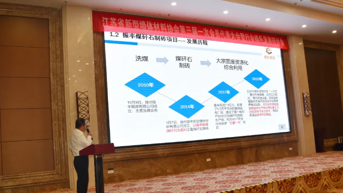 大會第二階段就進一步推進行業(yè)綠色發(fā)展進行了交流,徐州振豐新型墻體材料有限公司技術總監(jiān)崔皓介紹了徐州振豐公司煤矸石制磚項目在產(chǎn)業(yè)升級及循環(huán)經(jīng)濟產(chǎn)業(yè)鏈延伸探索方面的經(jīng)驗,該公司年產(chǎn)7.2億塊煤矸石隧道窯燒結(jié)磚協(xié)同處置項目被列入徐州市“無廢城市”試點示范項目;新華盛節(jié)能科技有限公司副總經(jīng)理陳志明以“企業(yè)綠色轉(zhuǎn)型發(fā)展介紹”為題,介紹了該公司的基本情況及研發(fā)的新產(chǎn)品免燒自保溫多孔砌塊;南通恒達機械制造有限公司總工程師于銀龍以“創(chuàng)新發(fā)展,恒達永遠在路上”為題,介紹了南通恒達移動式隧道窯、打包機和碼垛機等產(chǎn)品的技術優(yōu)點以及客戶案例。三位嘉賓的報告贏得了與會代表們的熱烈掌聲。